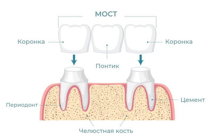 Мостовидный протез предназначен для восстановления от одного до трех соседних зубов. Для его установки собственные зубы обрабатываются и покрываются коронками, а отсутствующие зубы восполняются коронками, соединенными в единое целое с опорными коронками. Для его изготовления используется металлокерамика или цирконий.